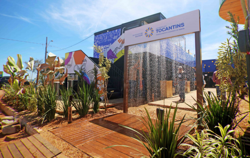 O estande da Educação chama a atenção pelo visual moderno, funcional e ecologicamente responsável, com um espaço pensado para garantir conforto aos visitantes. A estrutura foi montada com containers reutilizados, pallets, cobertura de policarbonato, tendas com proteção UV e duas cascatas que, além de integrarem o espaço instagramável, contribuem para o conforto térmico do ambiente.