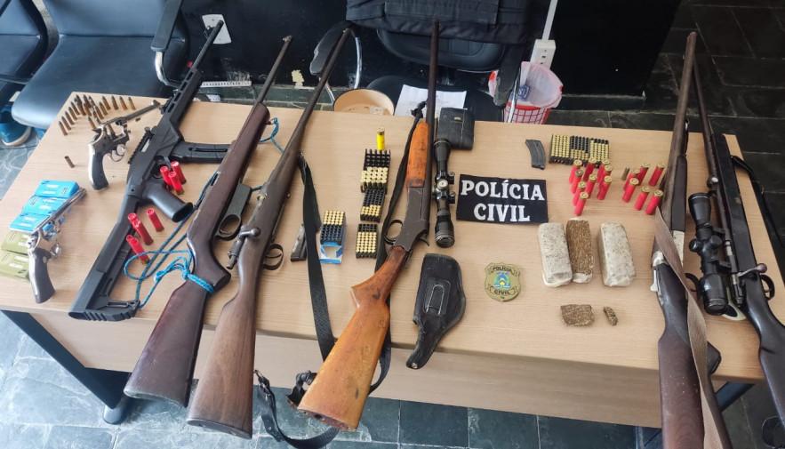 O segundo mandado resultou na apreensão de uma arma longa de calibre 20 e 53 munições de calibre 22, além de 19 munições de calibre 38.