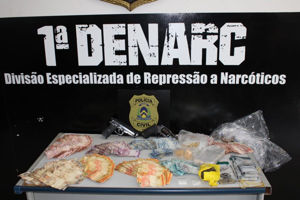 Duas pessoas presas, cerca de R$10 mil em espécie, uma arma de fogo, um simulacro, munições, celulares e uma expressiva quantidade de drogas. Esse é o resultado de mais uma ação de combate ao tráfico de drogas realizada pela Polícia Civil, por meio da 1ª Divisão Especializada de Repressão a Narcóticos (Denarc – Palmas), no início da tarde desta sexta-feira, 4, que culminou em mais um ponto de venda de drogas fechado.